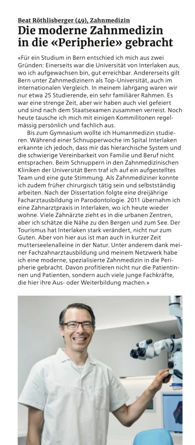 Das Magazin «Gesundheit Berner Oberland»: Entstanden in Zusammenarbeit mit der Spitäler fmi AG und der Spital STS AG, sowie weiteren Gesundheitsinstitutionen des Berner Oberlands. Mit Beiträgen von Dr. Beat Röthlisberger: In der April-Ausgabe über Parodontitis (siehe S. 12) und in der Oktober-Ausgabe über Implantatbehandlungen (siehe S. 26).